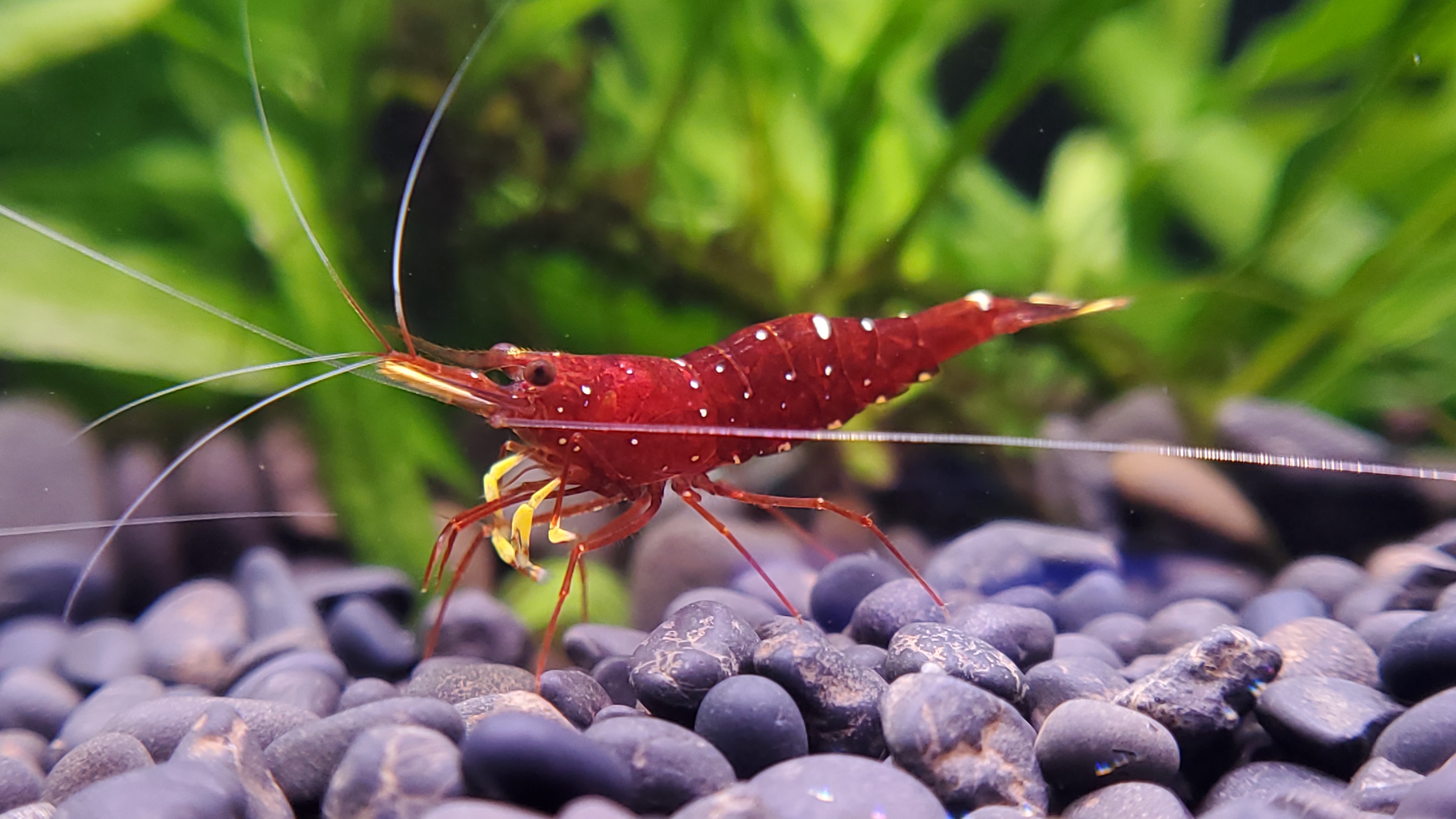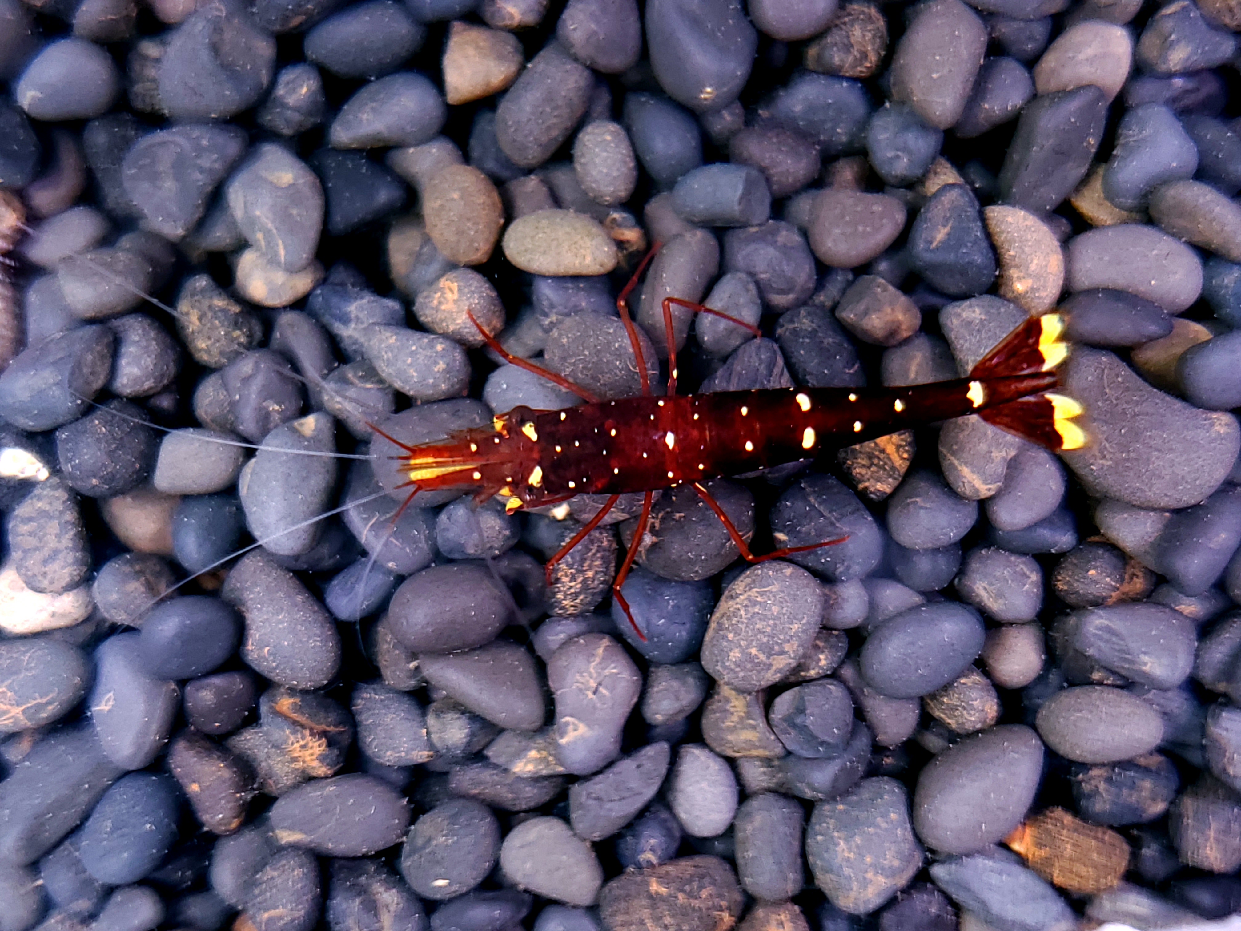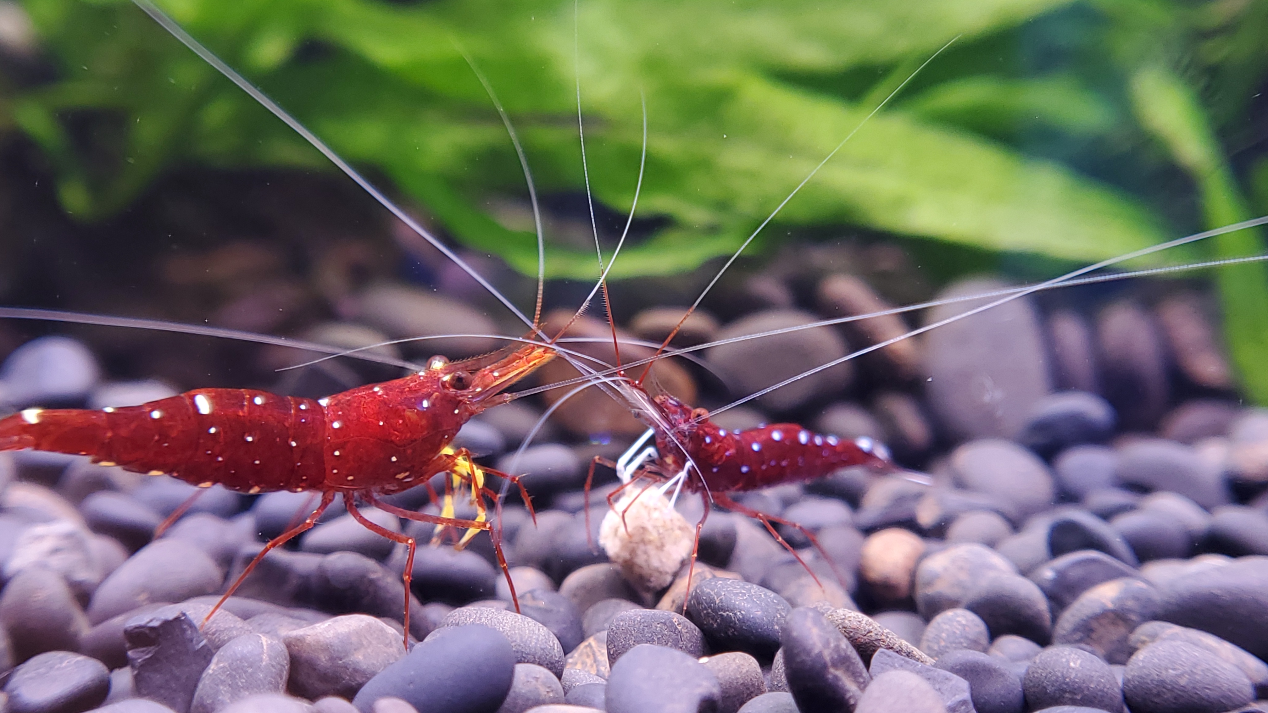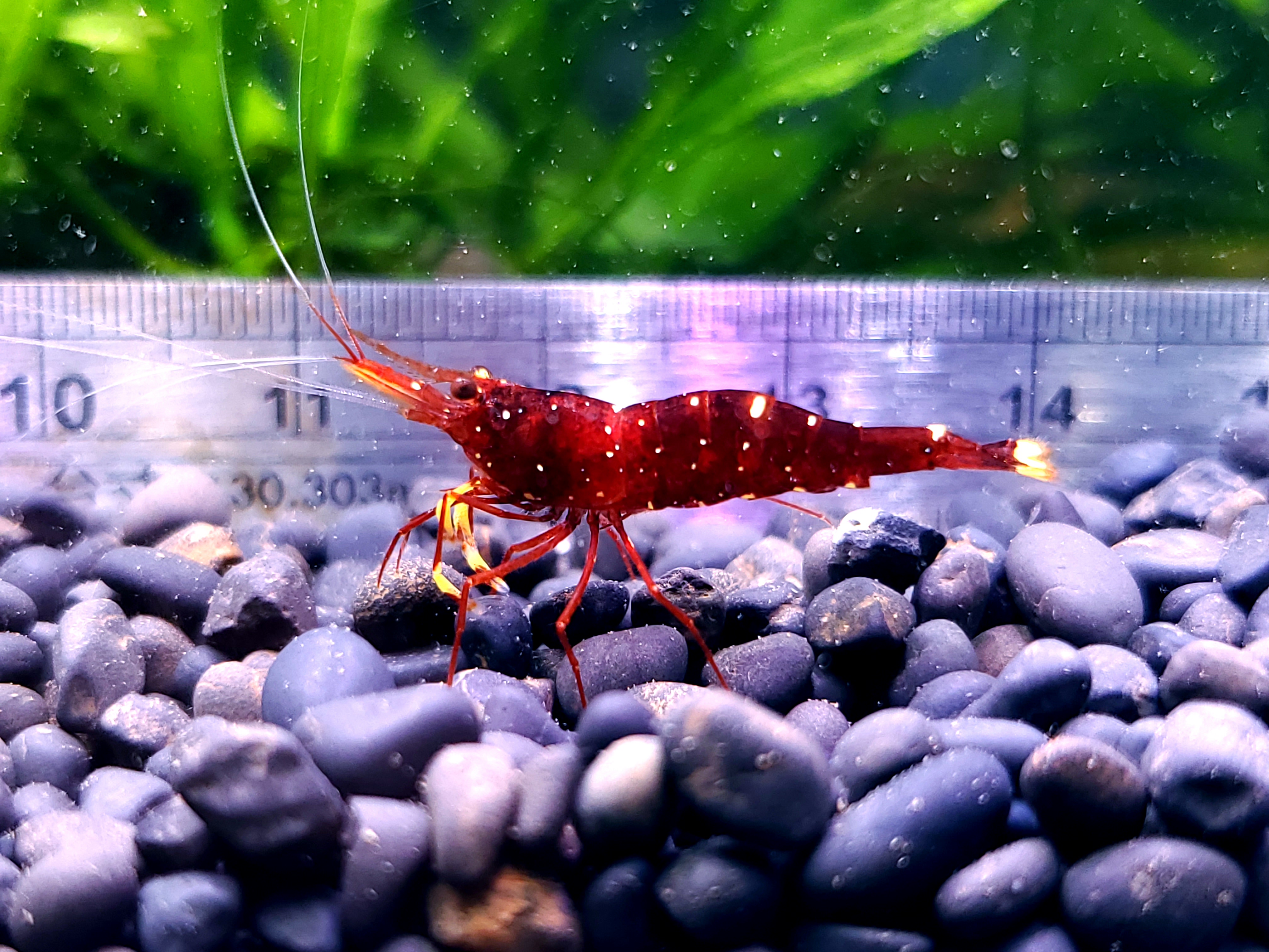 照片中的蝦是「黃襪蝦」的母蝦,成體體長可達近3mm,相當大型。這可能是雜交後代的一個優勢,因為它們的體型變大,使它們能夠在缸中競爭並搶走其他蝦的交配權。