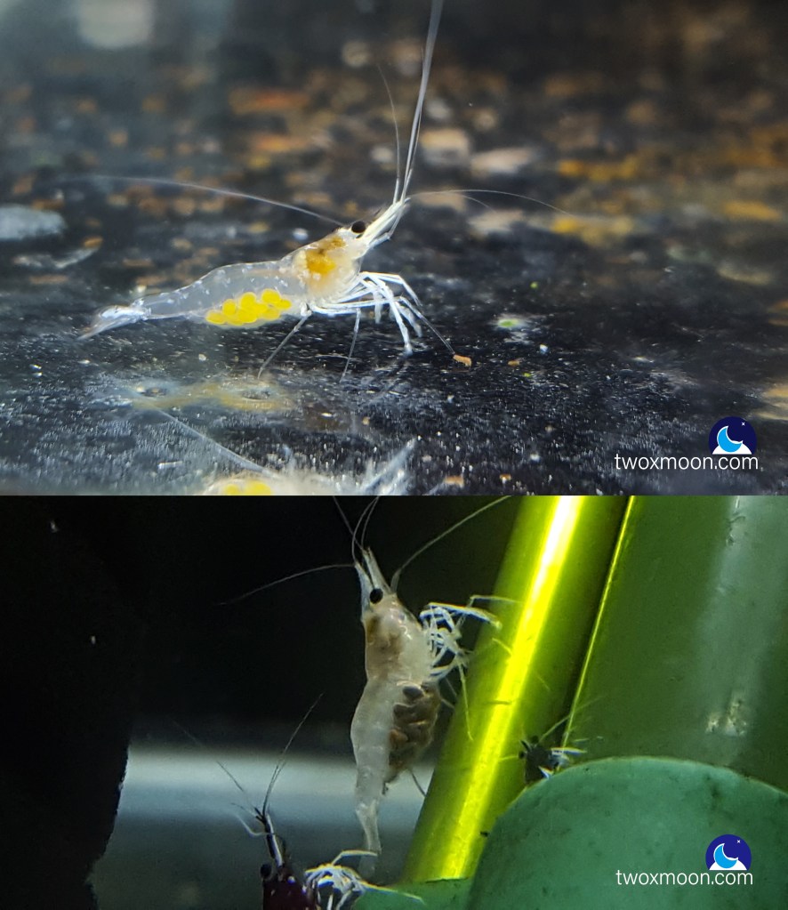 在上方影片中的母蝦於記錄次日(2024/5/6)抱蛋,經過大約 20 多天,我們終於看到了小蝦的誕生,幾乎可以確認該變異是可被保留並延續的。目前,我們觀察到兩隻雪白色的小蝦,另一隻母蝦也順利抱蛋。希望這一次能夠得到足夠的數量,來擴大「初雪」的母群。