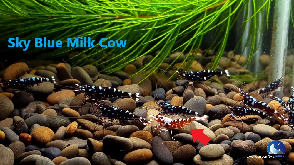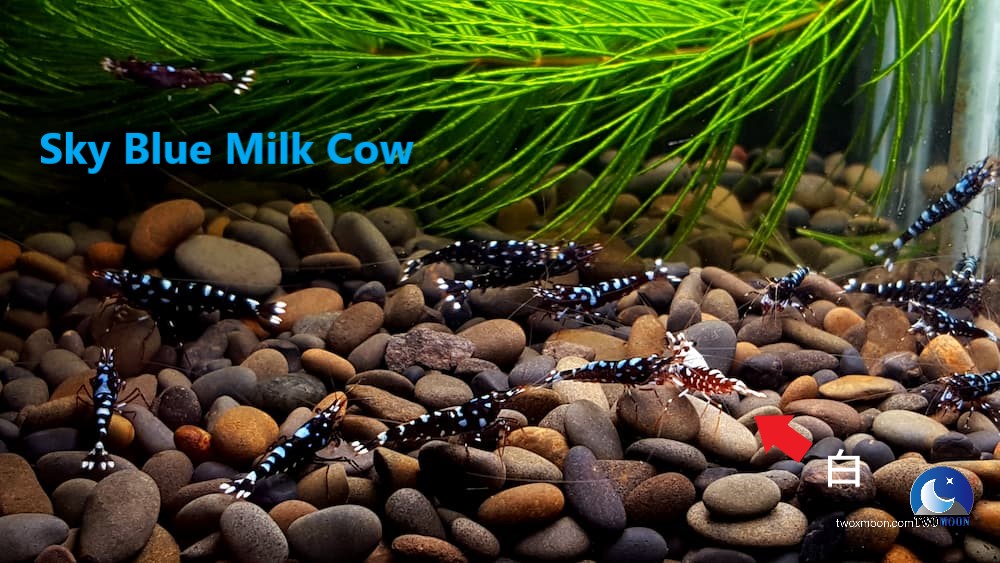 “天空藍乳牛”(Sky Blue Cow)是由三點白(Caridina sp. “trimaculata”)經過人工選育而來的蘇拉維西蝦品種。在育種過程中,育種者精選具有藍色表現的個體,並嘗試透過多代繁殖與嚴格篩選,使藍色色素的遺傳趨於穩定。目前,該品系已能以較高比例遺傳藍色色素,但仍有進一步優化與提升的空間。